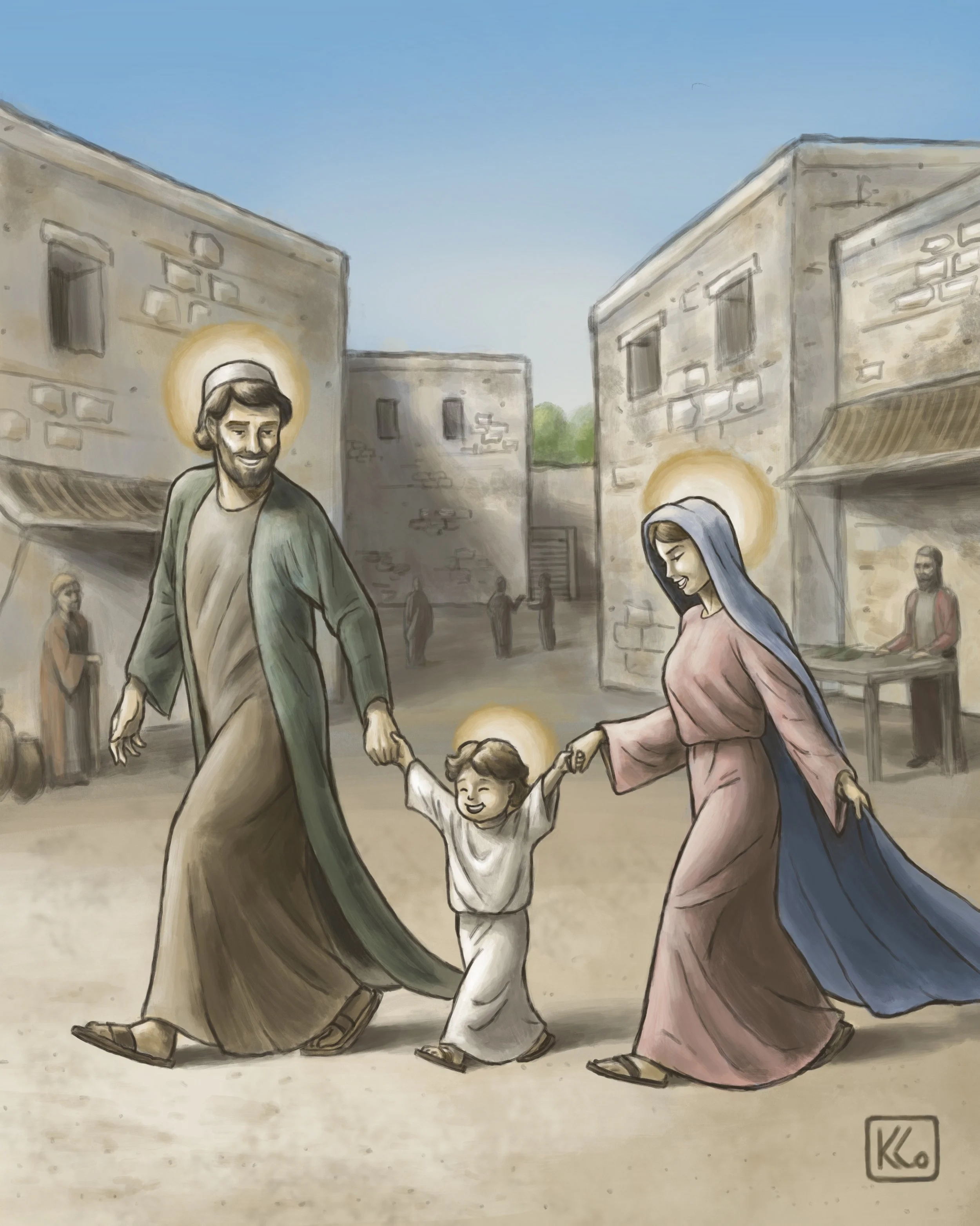 This illustration was born out of a deep pondering of what everyday life was like for Jesus, Mary and Joseph in the town of Nazareth. I imagine it was full of simple, ordinary moments sanctified by the perfect love they shared.